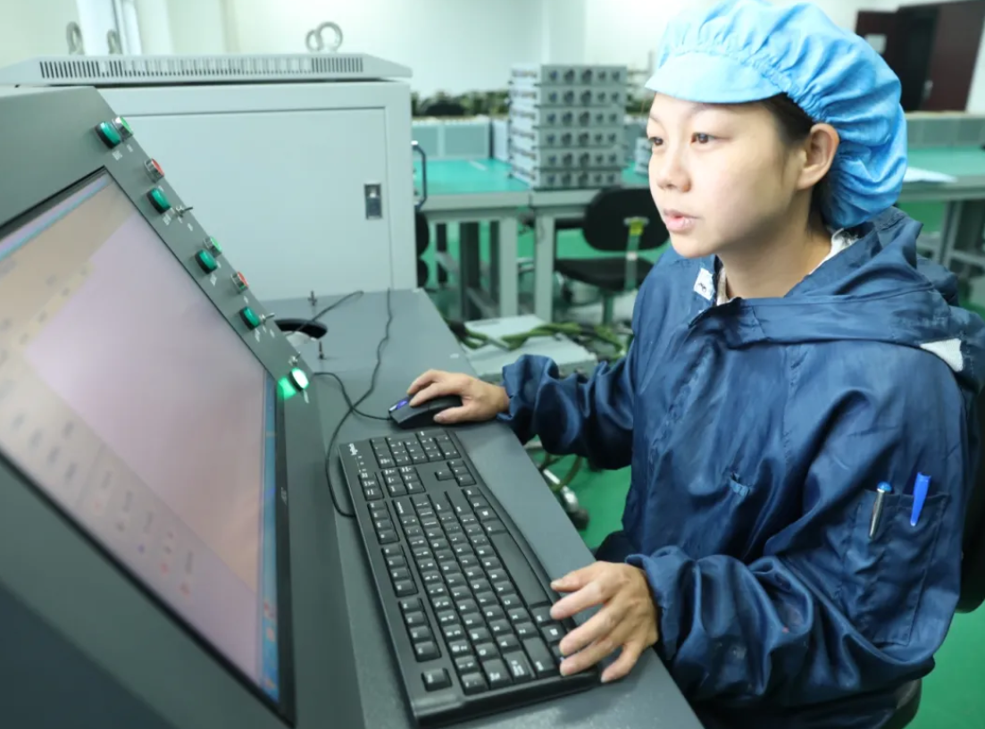 江山重工研究院總裝車間電裝線上,檢驗人員正在認真地操作線纜檢測儀,對某箱體內部線纜通斷及絕緣阻值進行檢測,排查線纜質量隱患。