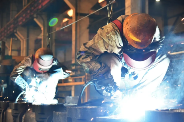 一機集團裝焊車間生產一線,職工手握焊槍和焊帽在車體頂部進行高處焊接作業,確保產品如期交付。